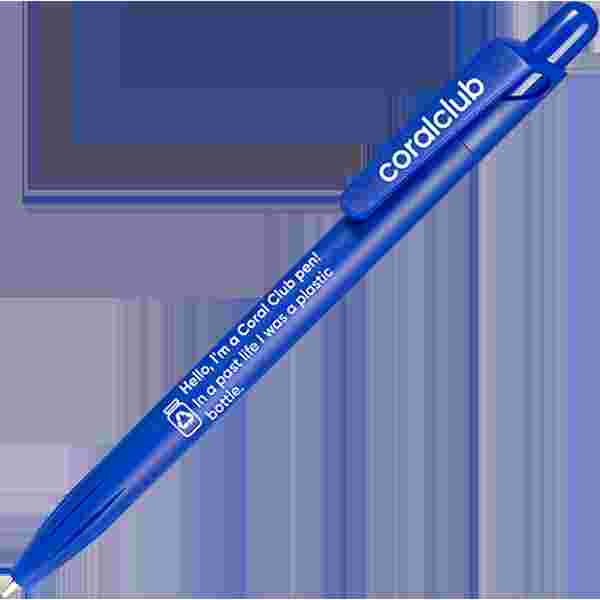 Pix cu bilă și mecanism cu buton, din material PET-RECYCLED cu inscripția „Salut, sunt pixul Coral Club! Într-o viață anterioară am fost sticlă din plastic”.
